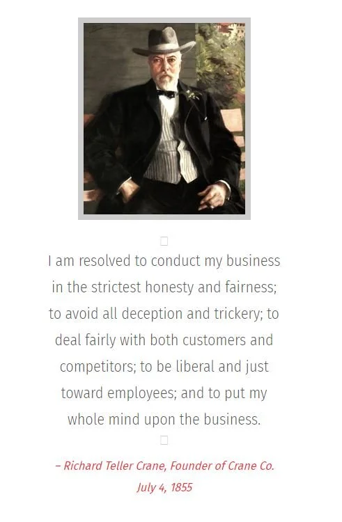On July 4, 1855, Crane’s founder R.T. Crane, who was in his early 20s at the time, wrote a resolution that has been the foundation of the company’s culture for more than 165 years committing to conducting business in the strictest honesty and fairness.
